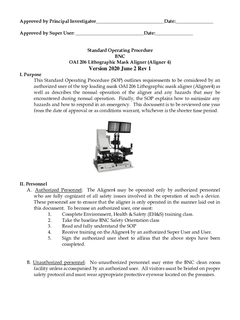 Approved by Principal Investigator___Date:___ Approved by Super User: ___Date:___ Standard Operating Procedure BNC OAI 206 Lithographic Mask Aligner (Aligner 4)Version 2020 June 2 Rev 1 I. Purpose