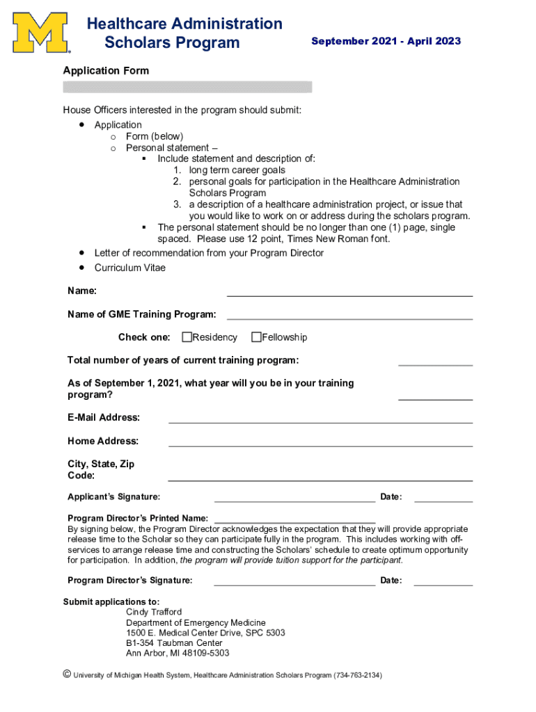 Healthcare Administration Scholars Program September 2021 April 2023Application Form House Officers interested in the program should submit: Application o Form (below) o Personal statement Include
