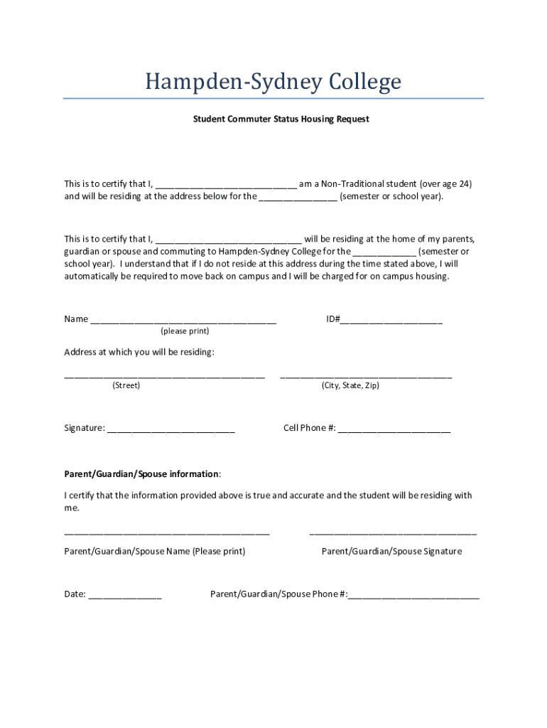 HampdenSydney College Student Commuter Status Housing Requests is to certify that I, ___ am a Nontraditional student (over age 24) and will be residing at the address below for the ___ (semester or
