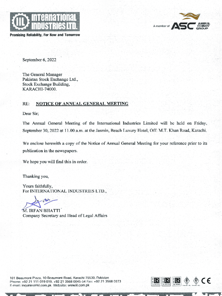 IflTORflTIOflL Industries LTD.ADMIRE. CHINO GROUPAmemberofPromising Reliability, For Now and Tomorrow September 6, 2022The General Manager Pakistan Stock Exchange Ltd., Stock Exchange Building, KARACHI74000.RE:NOTICE