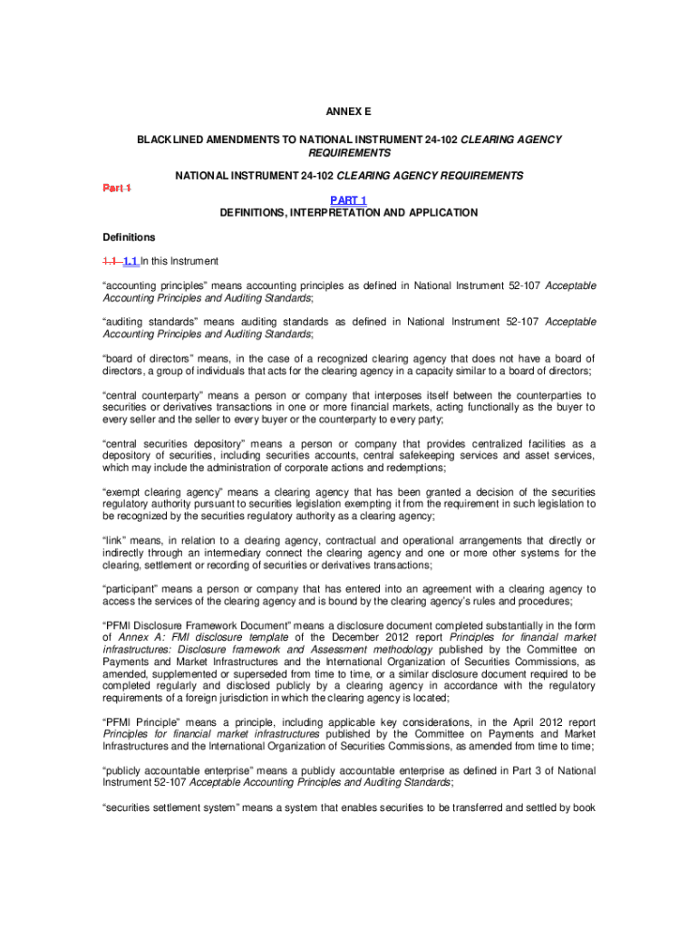 ANNEX E BLACKENED AMENDMENTS TO NATIONAL INSTRUMENT 24102 CLEARING AGENCY REQUIREMENTS NATIONAL INSTRUMENT 24102 CLEARING AGENCY REQUIREMENTS Part 1 PART 1 DEFINITIONS, INTERPRETATION AND APPLICATION