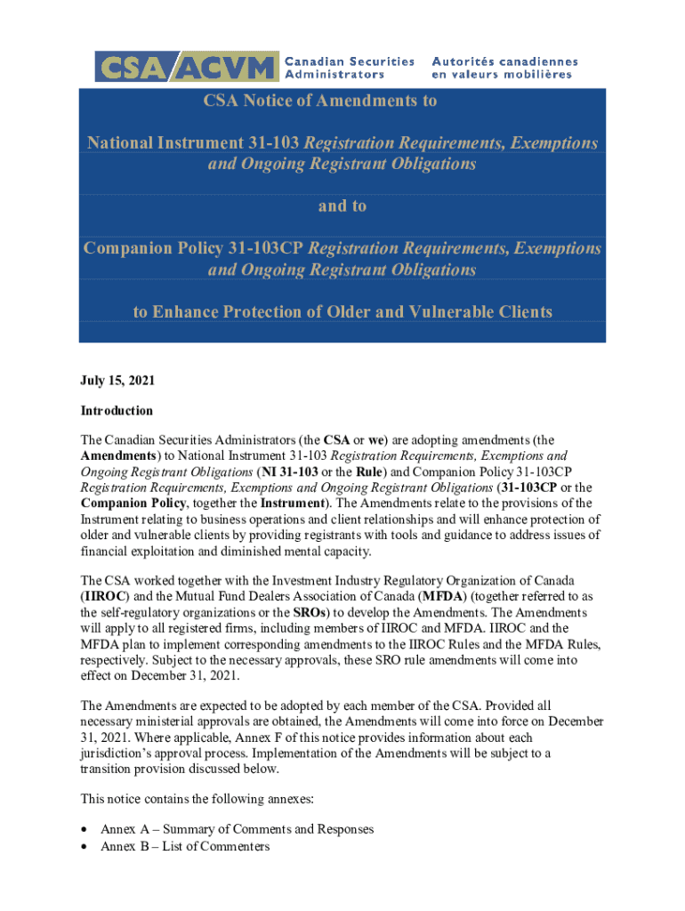 1CSA Notice of Amendments to National Instrument 31103 Registration Requirements, Exemptions and Ongoing Registrant Obligations and to Companion Policy 31103CP Registration Requirements, Exemptions