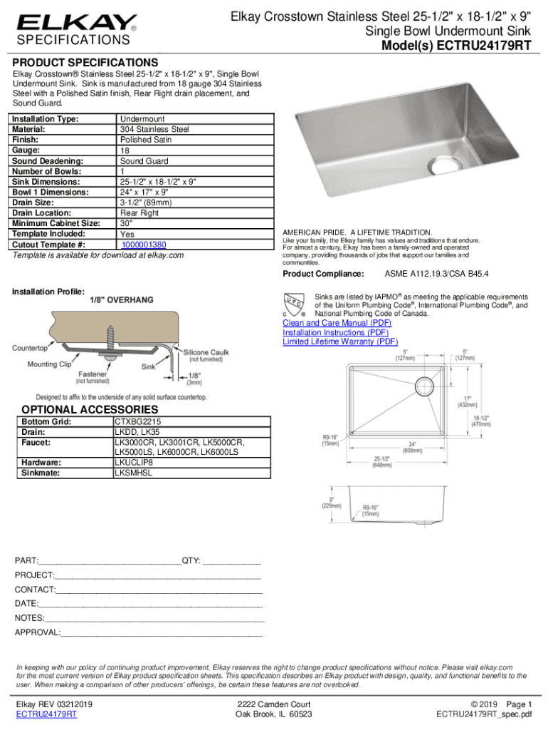 SPECIFICATIONSElkay Crosstown Stainless Steel 251/2\” x 181/2\” x 9\” Single Bowl Under mount Sink Model(s) ECTRU24179RTPRODUCT SPECIFICATIONS Elway Crosstown Stainless Steel 251/2\” x 181/2\”