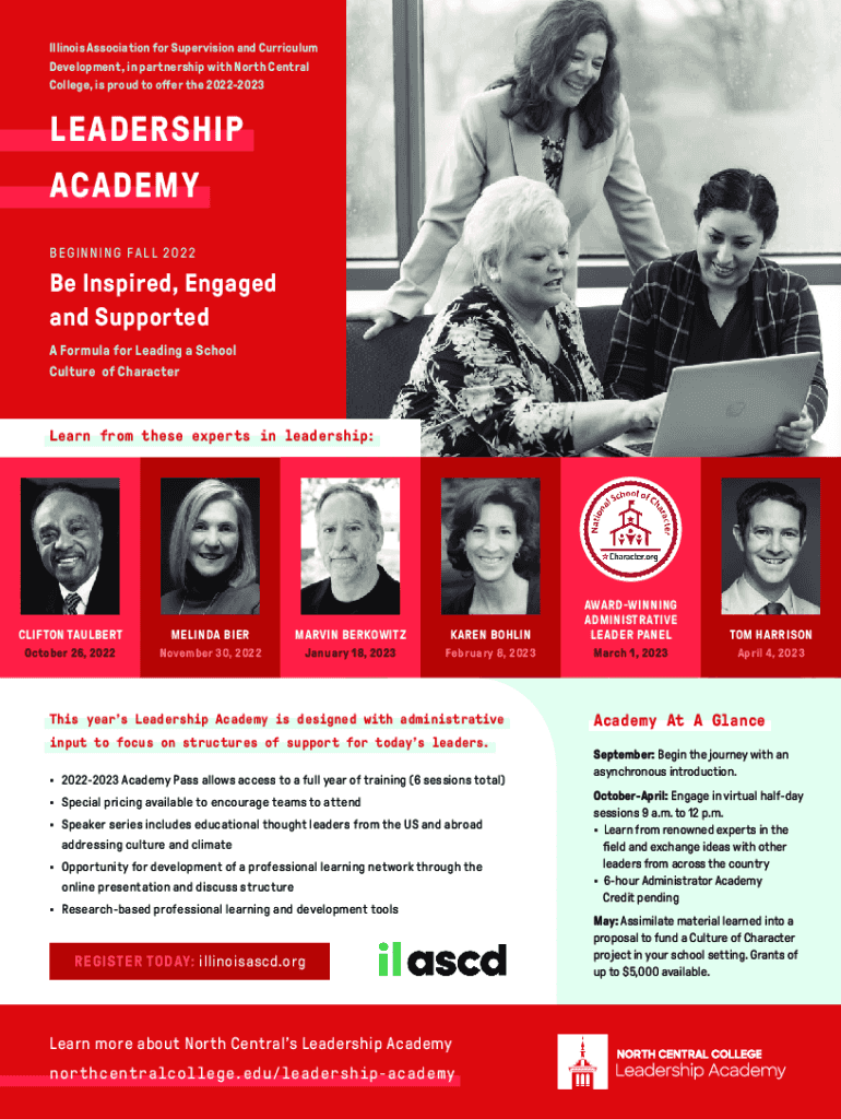 Illinois Association for Supervision and Curriculum Development, in partnership with North Central College, is proud to offer the 20222023LEADERSHIP ACADEMY BEGINNING FALL 2022Be Inspired, Engaged