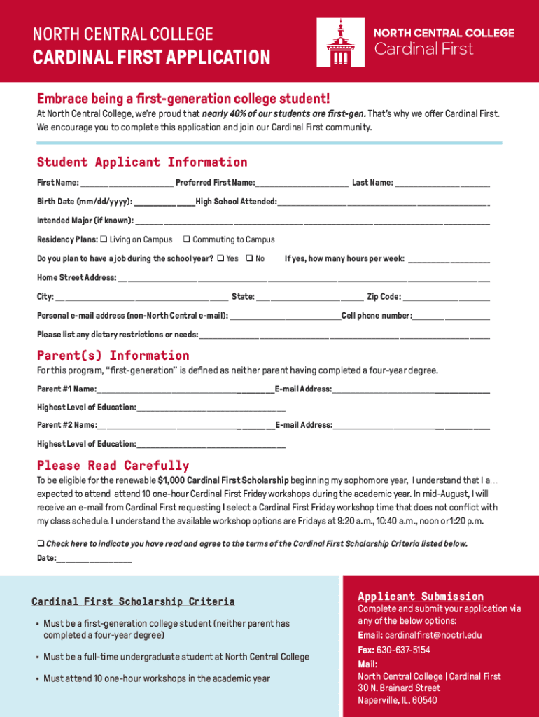 NORTH CENTRAL COLLEGECardinal FirstCARDINAL FIRST APPLICATION Embrace being a first generation college student! At North Central College, were proud that nearly 40% of our students are first gen.