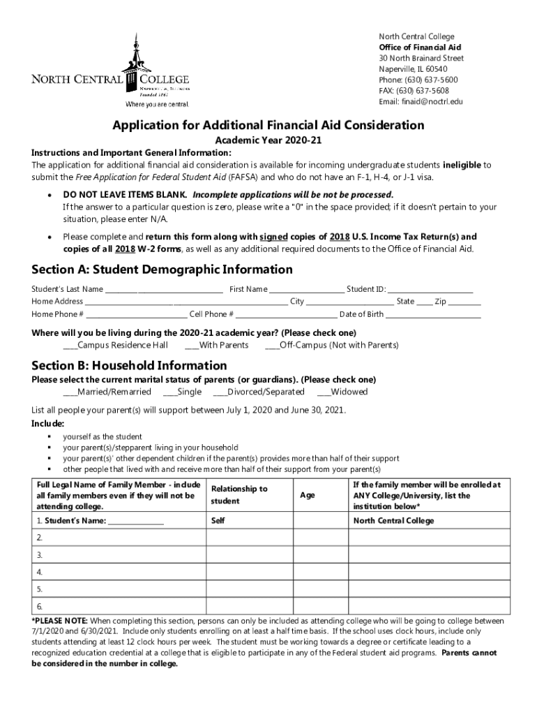 North Central College Office of Financial Aid 30 North Barnard Street Naperville, IL 60540 Phone: (630) 6375600 FAX: (630) 6375608 Email: finaid@noctrl.eduApplication for Additional Financial Aid