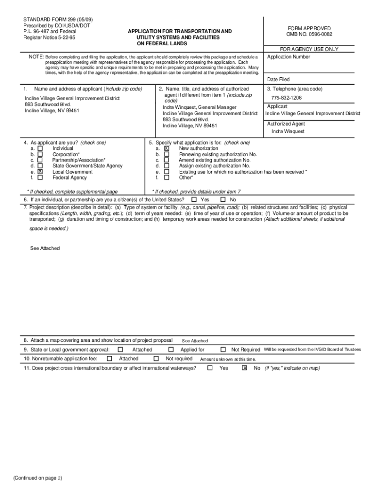 STANDARD FORM 299 (05/09) Prescribed by DOI/USDA/DOT P.L. 96487 and Federal Register Notice 52295FORM APPROVED OMB NO. 05960082APPLICATION FOR TRANSPORTATION AND UTILITY SYSTEMS AND FACILITIES ON