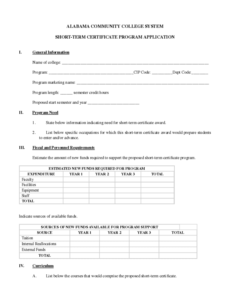 ALABAMA COMMUNITY COLLEGE SYSTEM SHORTER CERTIFICATE PROGRAM APPLICATION I. General Information Name of college: ___ Program: ___CIP Code: ___Dept Code:___ Program marketing name: ___ Program length: