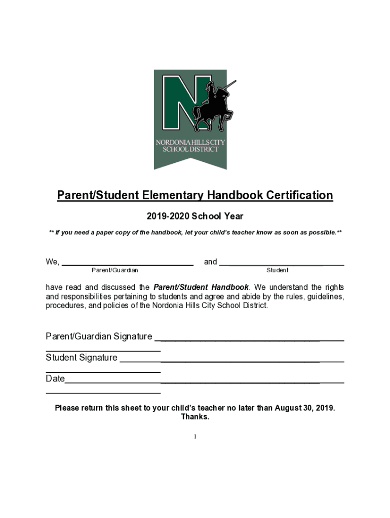 Parent/Student Elementary Handbook Certification 20192020 School Year ** If you need a paper copy of the handbook, let your children teacher know as soon as possible.**We, ___ Parent/Guardian and___