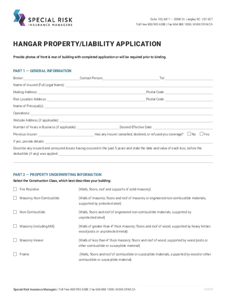 Suite 103, 8411 200th St. Langley BC. V2Y 0E7 Toll Free 800 993 6388 | Fax 604 888 1008 | WWW.RIM.HANGAR PROPERTY/LIABILITY APPLICATION Provide photos of front & rear of building with completed application