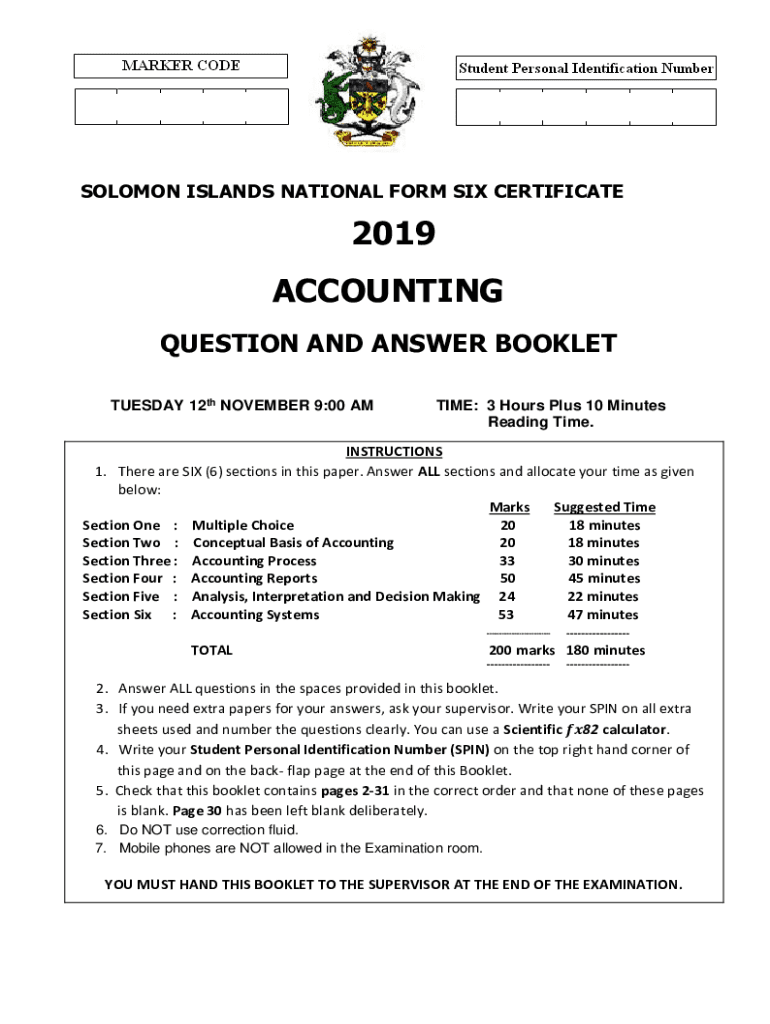 SOLOMON ISLANDS NATIONAL FORM SIX CERTIFICATE2019 ACCOUNTING QUESTION AND ANSWER BOOKLET TUESDAY 12th NOVEMBER 9:00 AM TIME: 3 Hours Plus 10 Minutes Reading Time. INSTRUCTIONS 1. There are SIX (6)
