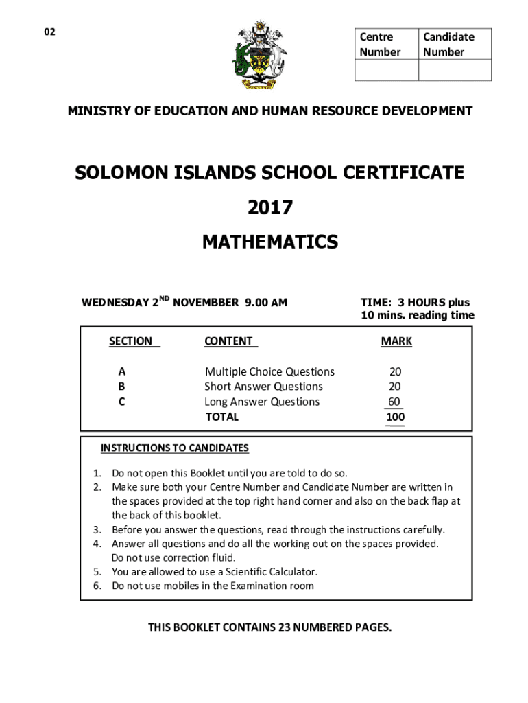 NumberMINISTRY OF EDUCATION AND HUMAN RESOURCE DEVELOPMENTSOLOMON ISLANDS SCHOOL CERTIFICATE