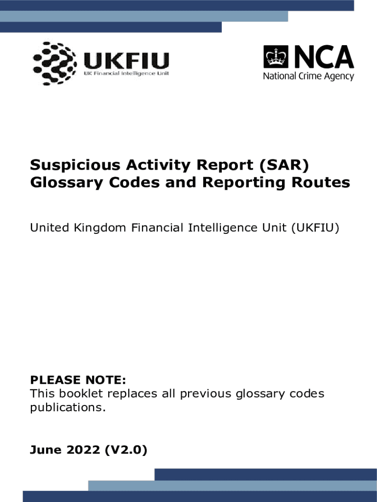 Suspicious Activity Report (SAR) Glossary Codes and Reporting Routes United Kingdom Financial Intelligence Unit (UNFIT)PLEASE NOTE: This booklet replaces all previous glossary codes publications.