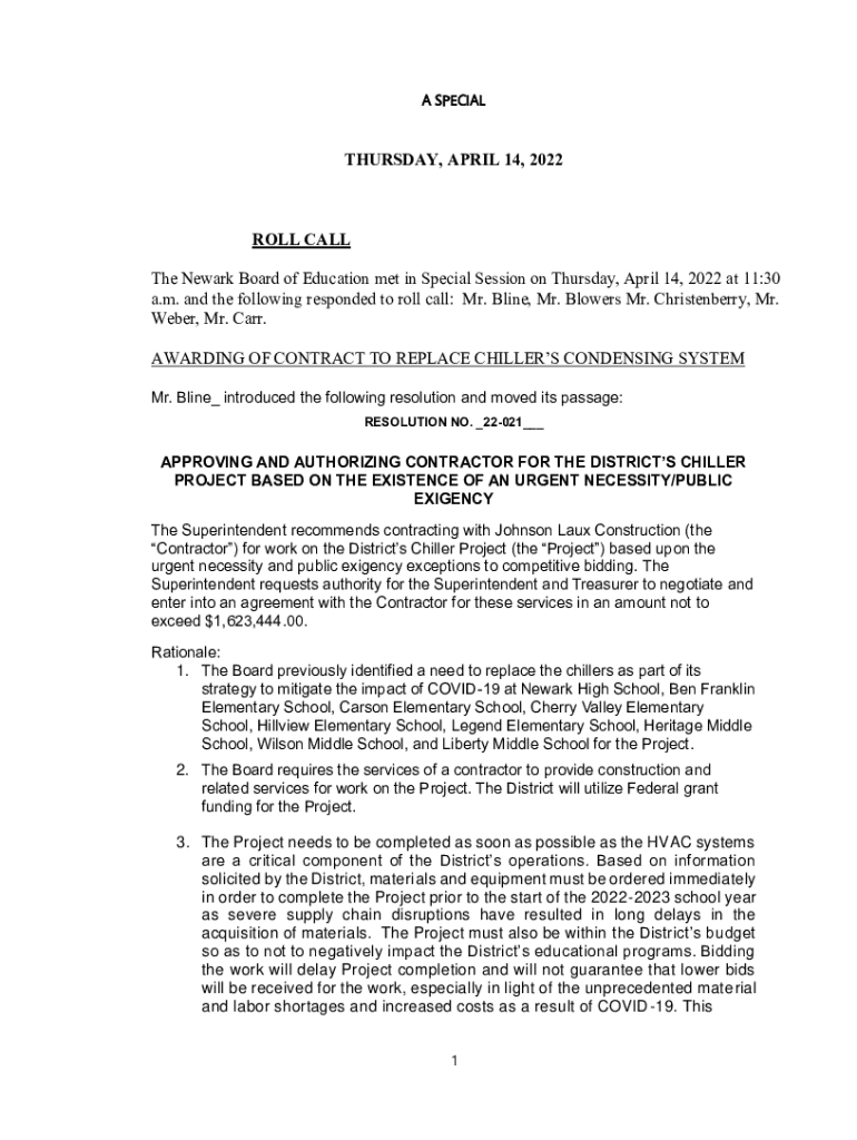 A SPECIALTHURSDAY, APRIL 14, 2022ROLL CALL The Newark Board of Education met in Special Session on Thursday, April 14, 2022, at 11:30 a.m. and the following responded to roll call: Mr. Line, Mr. Blowers