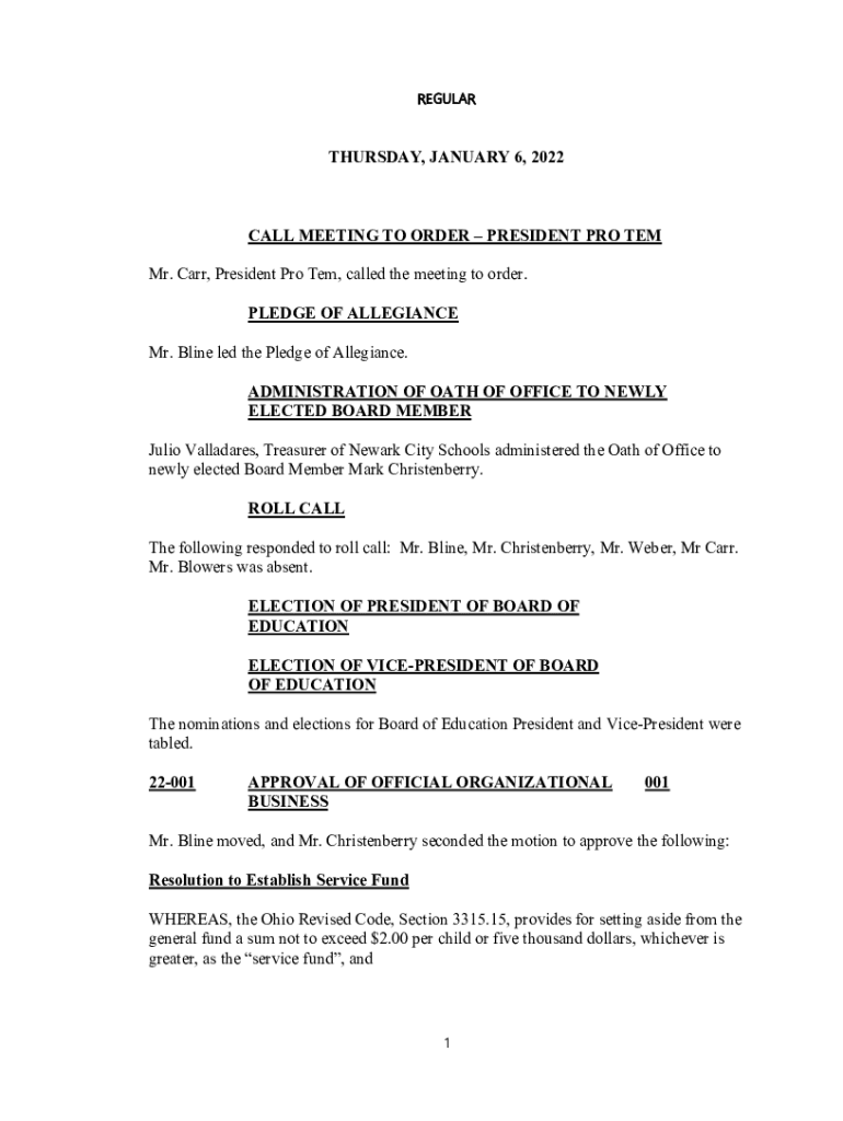 REGULARTHURSDAY, JANUARY 6, 2022CALL MEETING TO ORDER PRESIDENT PRO TEM Mr. Carr, President Pro Tem, called the meeting to order. PLEDGE OF ALLEGIANCE Mr. Line led the Pledge of Allegiance. ADMINISTRATION