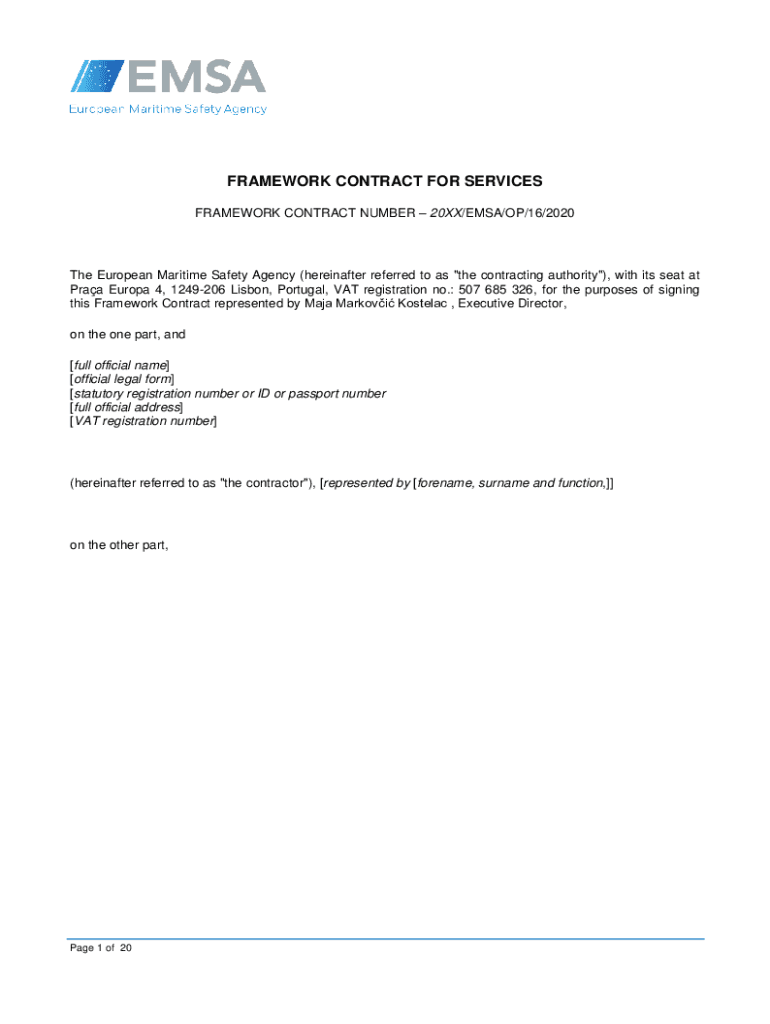 FRAMEWORK CONTRACT FOR SERVICES FRAMEWORK CONTRACT NUMBER 20XX/EMMA/OP/16/2020The European Maritime Safety Agency (hereinafter referred to as \” the contracting authority\”), with its seat at