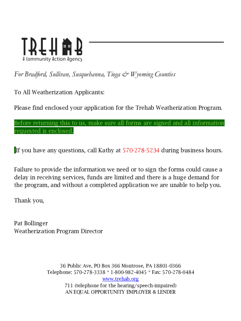___ For Bradford, Sullivan, Susquehanna, Toga & Wyoming Counties To All Weatherization Applicants: Please find enclosed your application for the Rehab Weatherization Program. Before returning this