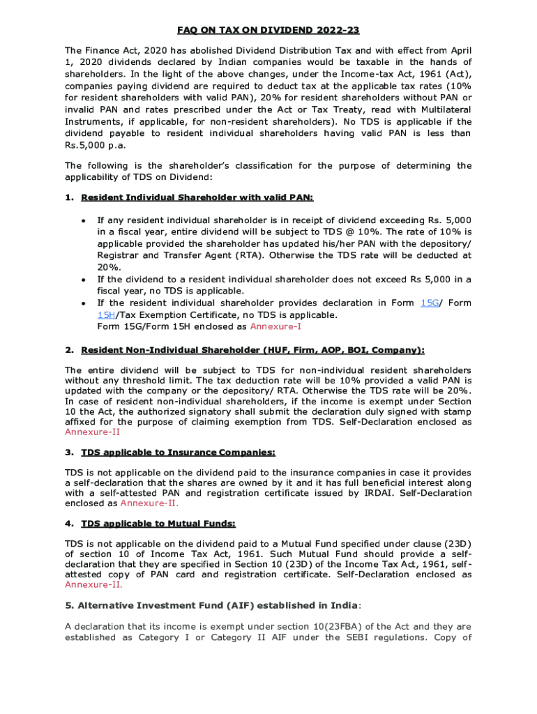 FAQ ON TAX ON DIVIDEND 202223 The Finance Act, 2020 has abolished Dividend Distribution Tax and with effect from April 1, 2020, dividends declared by Indian companies would be taxable in the hands