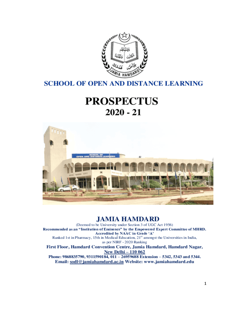 SCHOOL OF OPEN AND DISTANCE LEARNINGPROSPECTUS 2020 21JAMIA HARVARD (Deemed to be University under Section 3 of UGC Act 1956) Recommended as an Institution of Eminence by the Empowered Expert Committee