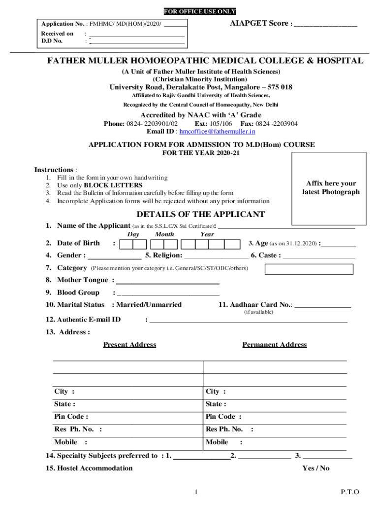 FOR OFFICE USE ONLYAIAPGET Score : ___Application No. FM HMC/ MD(HOM)/2020/ Received on D. D No.: :FATHER MULLER HOMEOPATHIC MEDICAL COLLEGE & HOSPITAL (A Unit of Father Muller Institute of Health
