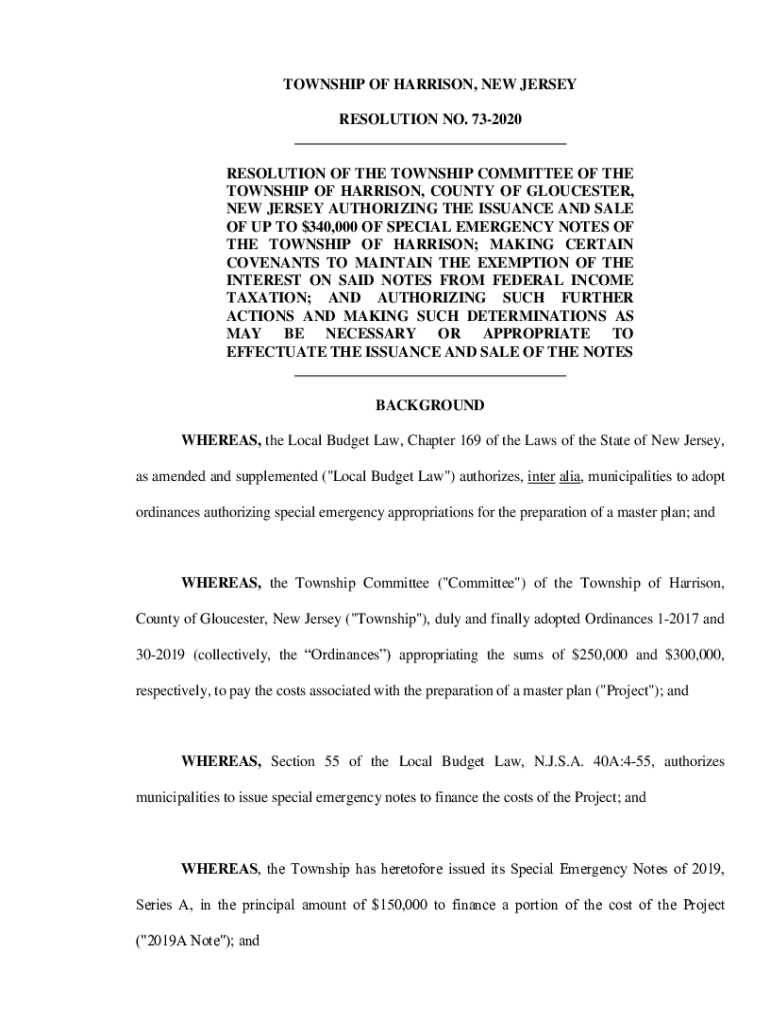 TOWNSHIP OF HARRISON, NEW JERSEY RESOLUTION NO. 732020RESOLUTION OF THE TOWNSHIP COMMITTEE OF THE TOWNSHIP OF HARRISON, COUNTY OF GLOUCESTER, NEW JERSEY AUTHORIZING THE ISSUANCE AND SALE OF UP TO