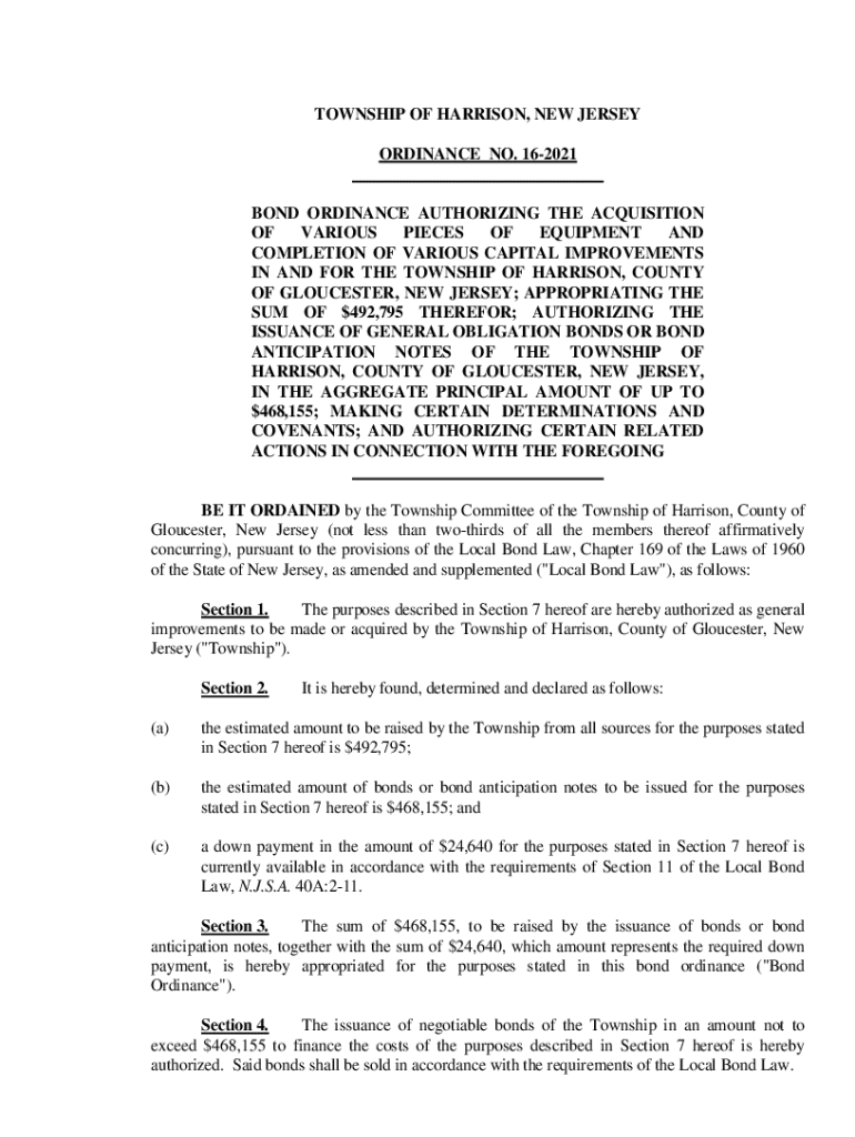 TOWNSHIP OF HARRISON, NEW JERSEY ORDINANCE NO. 162021BOND ORDINANCE AUTHORIZING THE ACQUISITION OF VARIOUS PIECES OF EQUIPMENT AND COMPLETION OF VARIOUS CAPITAL IMPROVEMENTS IN AND FOR THE TOWNSHIP