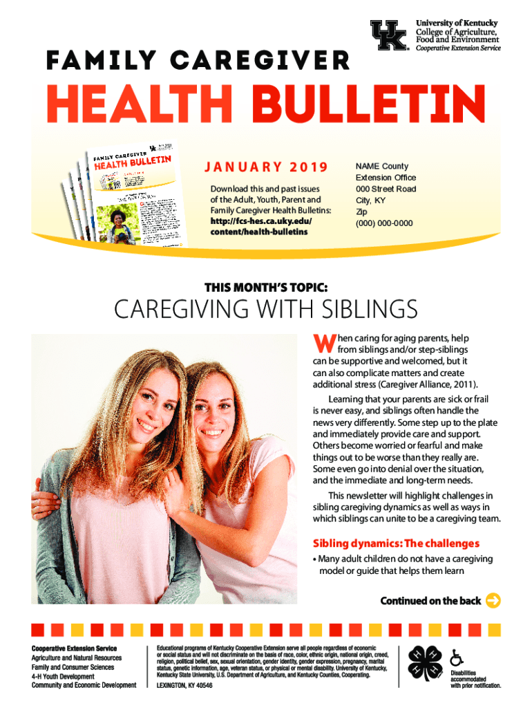 Get the free January 2019 Family Caregiver Health Bulletin. Caregiving with Siblings