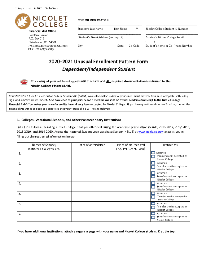 Complete and return this form to:Financial Aid Office Red Oak Center P.O. Box 518 Rhinelander, WI 54501 (715) 3654423 or (800) 5443039 FAX: (715) 3654918STUDENT INFORMATION: ___ Students Last Name