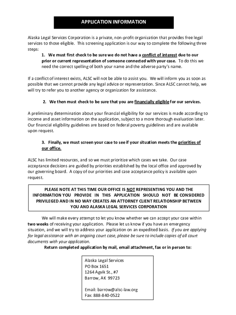 APPLICATION INFORMATION Alaska Legal Services Corporation is a private, nonprofit organization that provides free legal services to those eligible. This screening application is our way to complete