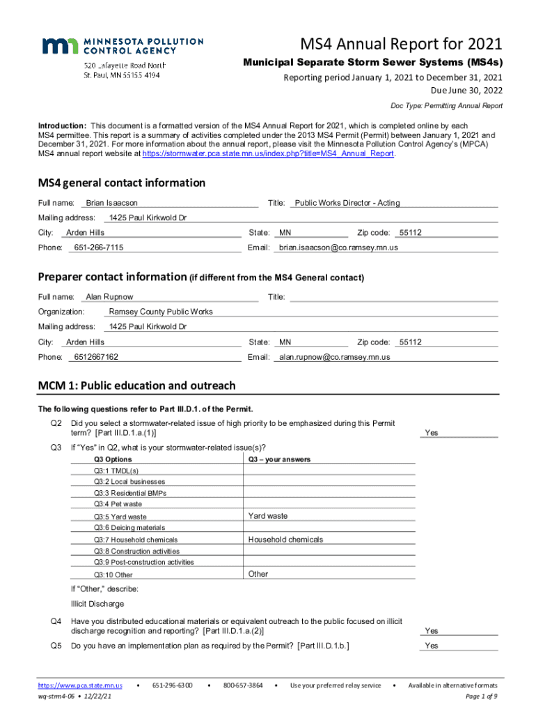 MS4 Annual Report for 2021Municipal Separate Storm Sewer Systems (MS4s) Reporting period January 1, 2021, to December 31, 2021, Due June 30, 2022, Doc Type: Permitting Annual ReportIntroduction: This