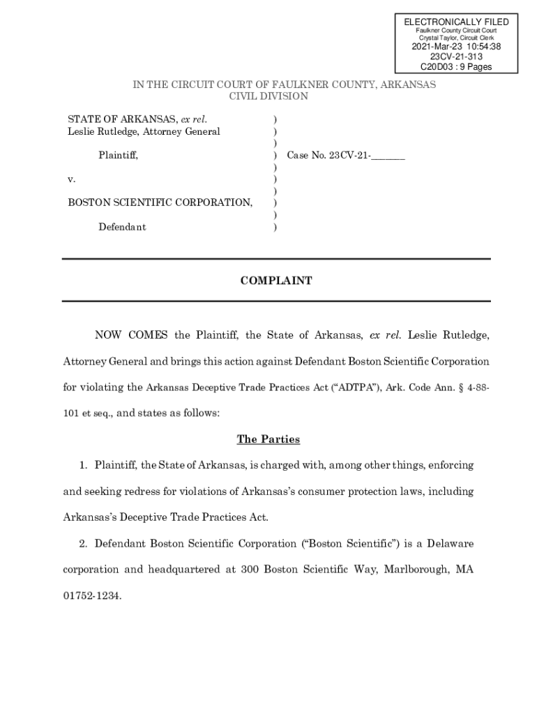 ELECTRONICALLY FILED Faulkner County Circuit Court Crystal Taylor, Circuit Clerk2021Mar23 10:54:38 23CV21313 C20D03 : 9 Pages IN THE CIRCUIT COURT OF FAULKNER COUNTY, ARKANSAS CIVIL DIVISION STATE