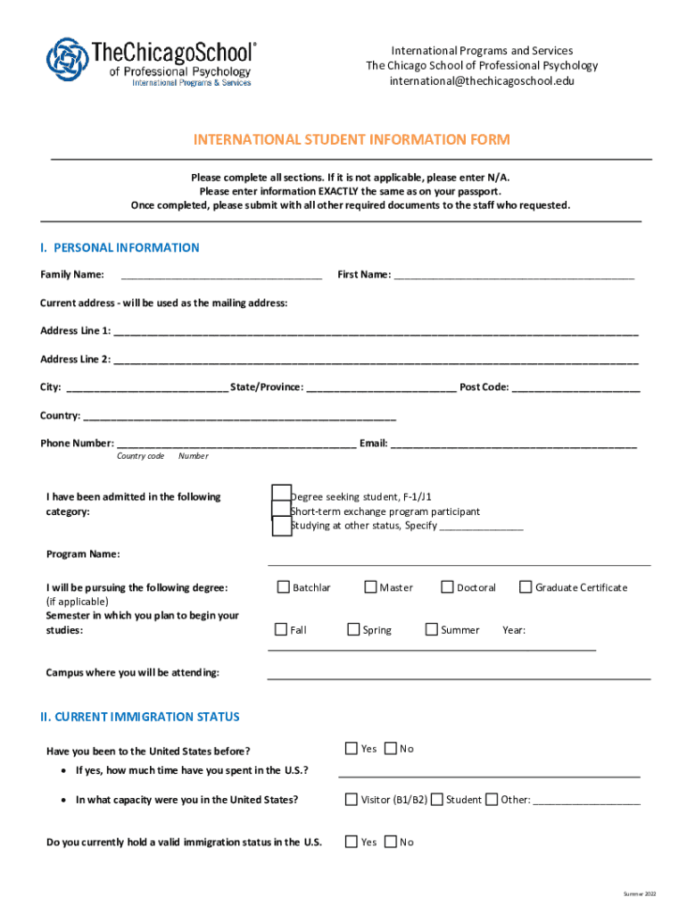 International Programs and Services The Chicago School of Professional Psychology international@thechicagoschool.eduINTERNATIONAL STUDENT INFORMATION FORM Please complete all sections. If it is not