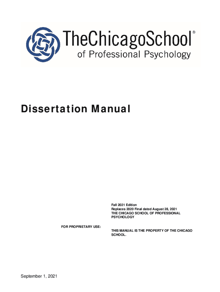 Dissertation Manually 2021 Edition Replaces 2020 Final dated August 28, 2021, THE CHICAGO SCHOOL OF PROFESSIONAL PSYCHOLOGY FOR PROPRIETARY USE: THIS MANUAL IS THE PROPERTY OF THE CHICAGO SCHOOL.