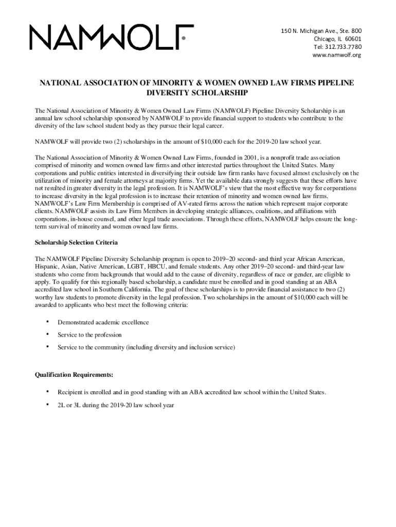 150 N. Michigan Ave., Ste. 800 Chicago, IL 60601 Tel: 312.733.7780 www.namwolf.orgNATIONAL ASSOCIATION OF MINORITY & WOMEN OWNED LAW FIRMS PIPELINE DIVERSITY SCHOLARSHIP The National Association of