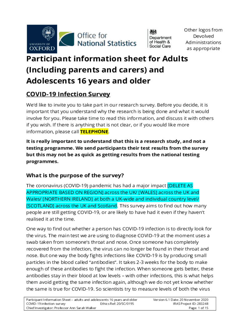 Other logos from Devolved Administrations as appropriateParticipant information sheet for Adults (Including parents and carers) and Adolescents 16 years and older COVID-19 Infection Survey We\'d like