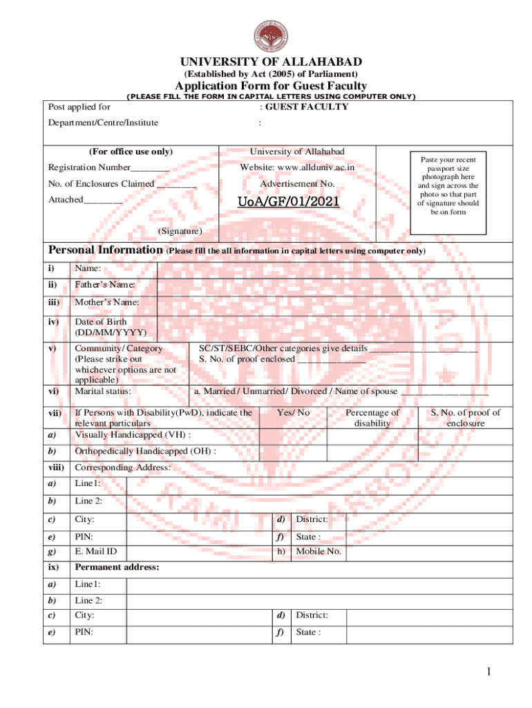 UNIVERSITY OF ALLAHABAD (Established by Act (2005) of Parliament)Application Form for Guest Faculty(PLEASE FILL THE FORM IN CAPITAL LETTERS USING COMPUTER ONLY)Post applied for: GUEST FACULTYDepartment/Center/Institute:(For