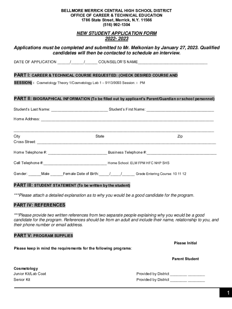 FILLMORE MERRICK CENTRAL HIGH SCHOOL DISTRICT OFFICE OF CAREER & TECHNICAL EDUCATION 1786 State Street, Merrick, N.Y. 11566 (516) 9921304NEW STUDENT APPLICATION FORM 2022 2023 Applications must be
