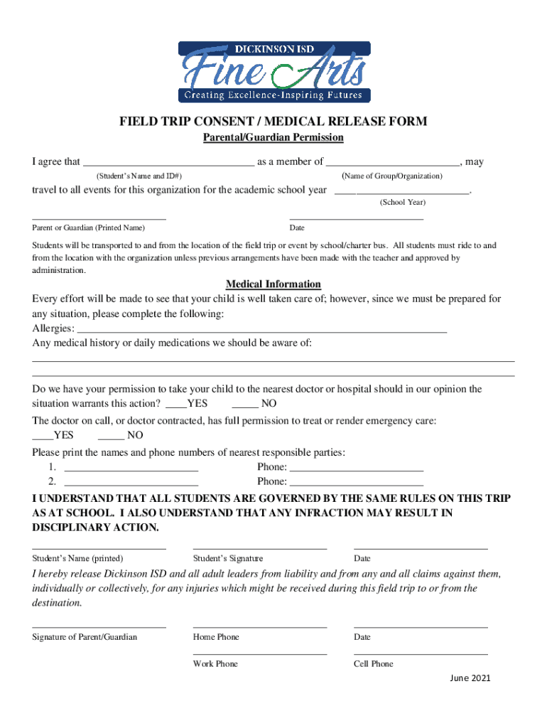 FIELD TRIP CONSENT / MEDICAL RELEASE FORM Parental/Guardian Permission I agree that ___ as a member of ___, may (Students Name and ID#)(Name of Group/Organization)travel to all events for this organization
