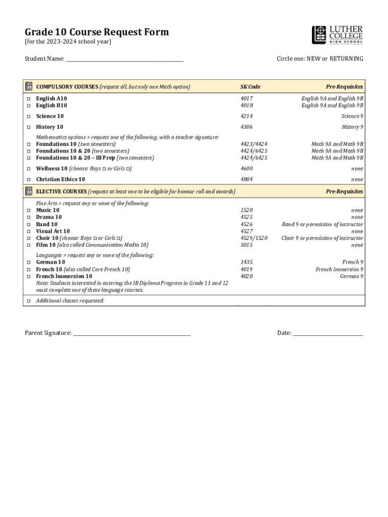 Grade 10 Course Request Form (for the 20232024 school year)Student Name: ___COMPULSORY COURSES (request all, but only one Math option)Circle one: NEW or RETURNING SK CodePreRequisites English A10