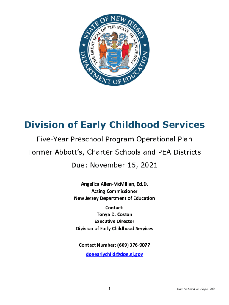 Division of Early Childhood Services Livelier Preschool Program Operational Plan Former Abbott's, Charter Schools and PEA Districts Due: November 15, 2021, Angelica Allen McMillan, Ed. D. Acting Commissioner