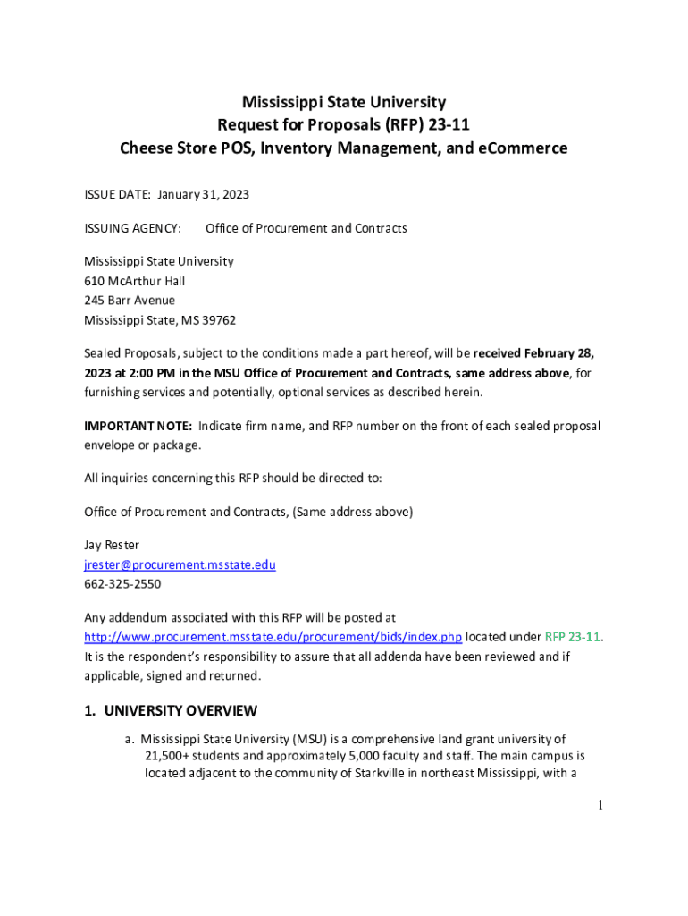 Mississippi State University Request for Proposals (RFP) 2311 Cheese Store POS, Inventory Management, and e-commerce ISSUE DATE: January 31, 2023, ISSUING AGENCY:Office of Procurement and Contracts