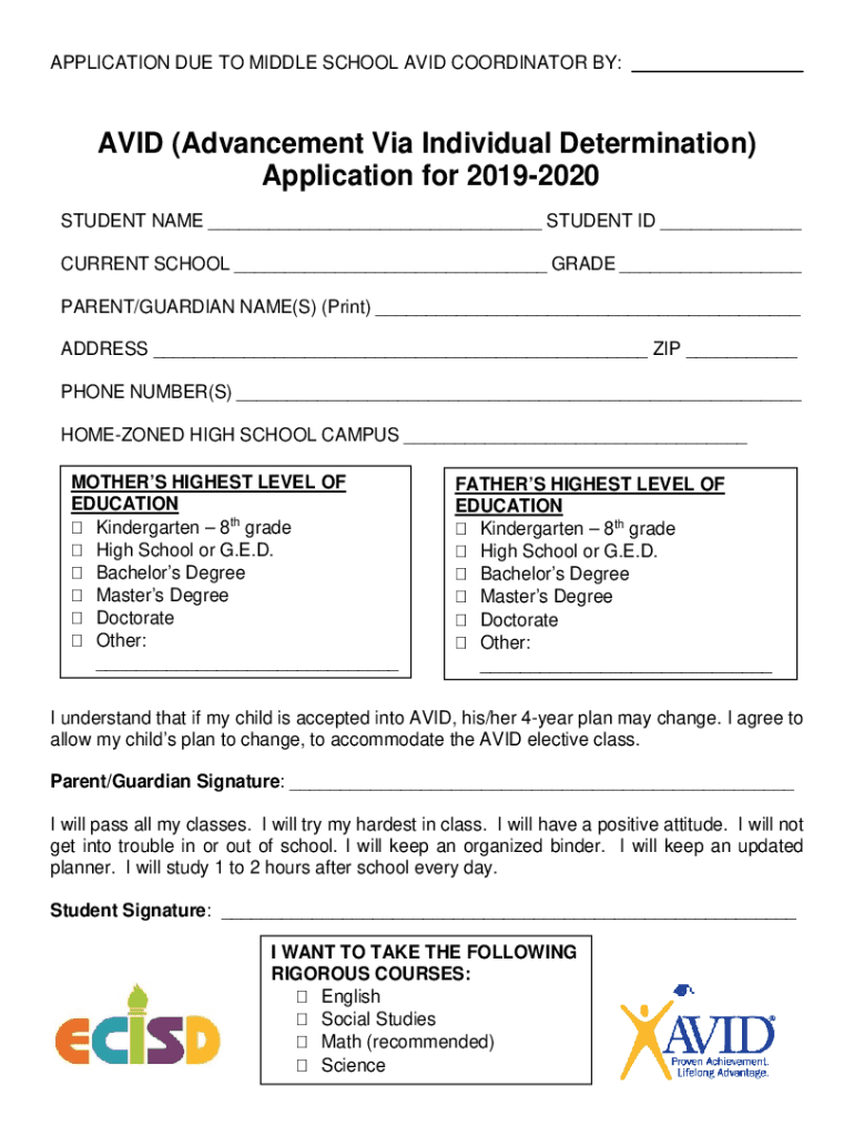 APPLICATION DUE TO MIDDLE SCHOOL AVID COORDINATOR BY: ___AVID (Advancement Via Individual Determination) Application for 20192020 STUDENT NAME ___ STUDENT ID ___ CURRENT SCHOOL ___ GRADE ___ PARENT/GUARDIAN