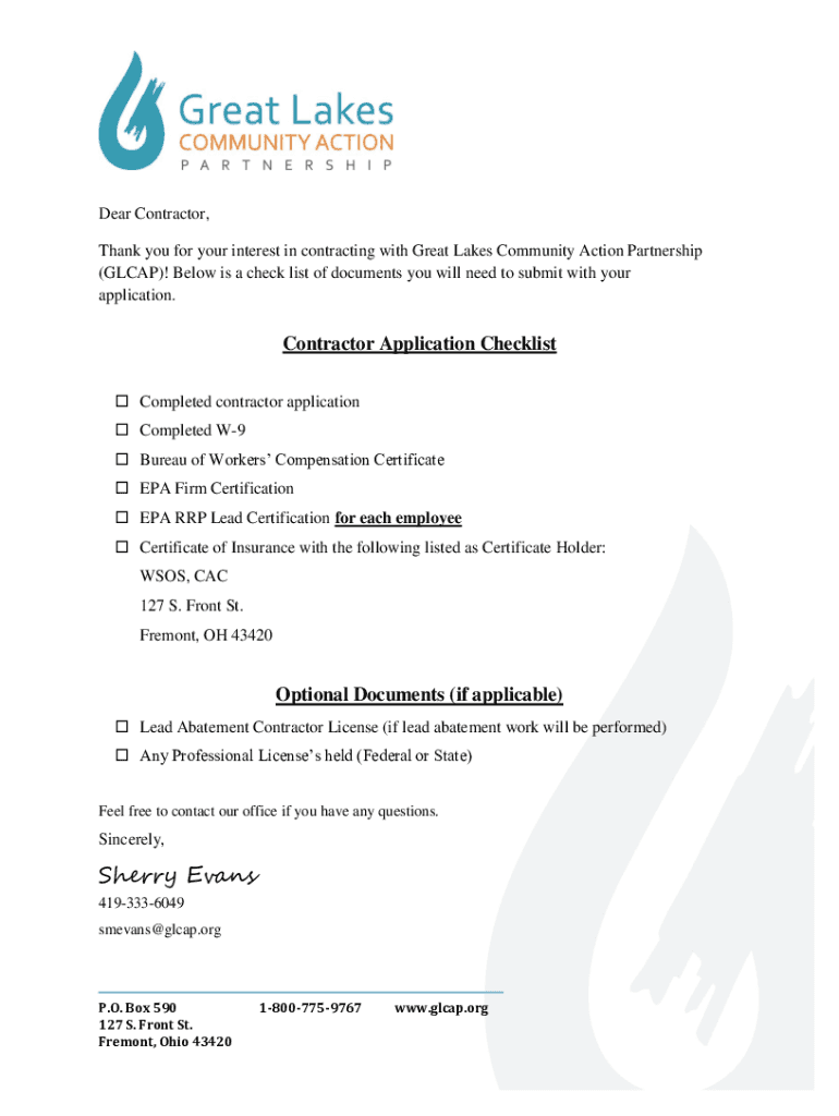 Dear Contractor, Thank you for your interest in contracting with Great Lakes Community Action Partnership (GELCAP)! Below is a checklist of documents you will need to submit with your application.