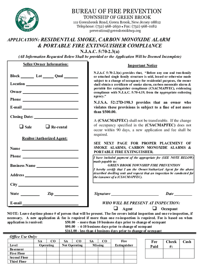 BUREAU OF FIRE PREVENTION TOWNSHIP OF GREEN BROOK111 Green brook Road, Green Brook, New Jersey 08812 Telephone: (732) 9682630 Fax: (732) 9680182 prevention@greenbrooktwp.orgAPPLICATION: RESIDENTIAL