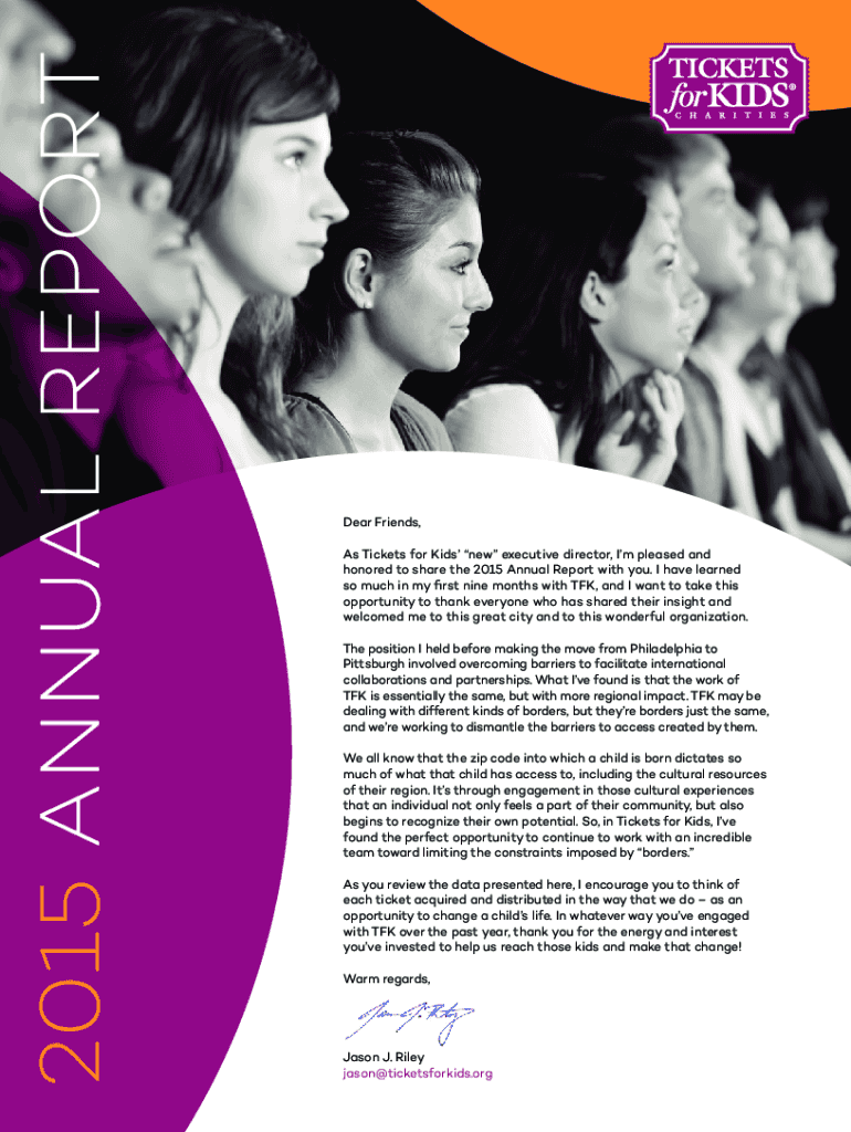 2015 ANNUAL Reporter Friends, As Tickets for Kids new executive director, I'm pleased and honored to share the 2015 Annual Report with you. I have learned so much in my first nine months with TFK,