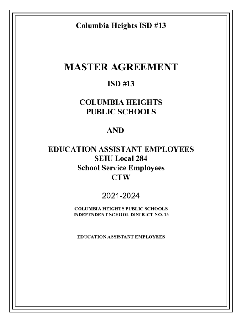 Columbia Heights ISD #13MASTER AGREEMENT ISD #13 COLUMBIA HEIGHTS PUBLIC SCHOOLS AND EDUCATION ASSISTANT EMPLOYEES SEU Local 284 School Service Employees BTW 20212024 COLUMBIA HEIGHTS PUBLIC SCHOOLS