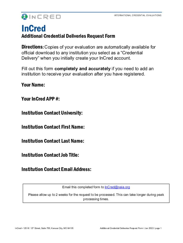 INTERNATIONAL CREDENTIAL EVALUATIONSInCredAdditional Credential Deliveries Request Form Directions: Copies of your evaluation are automatically available for official download to any institution you