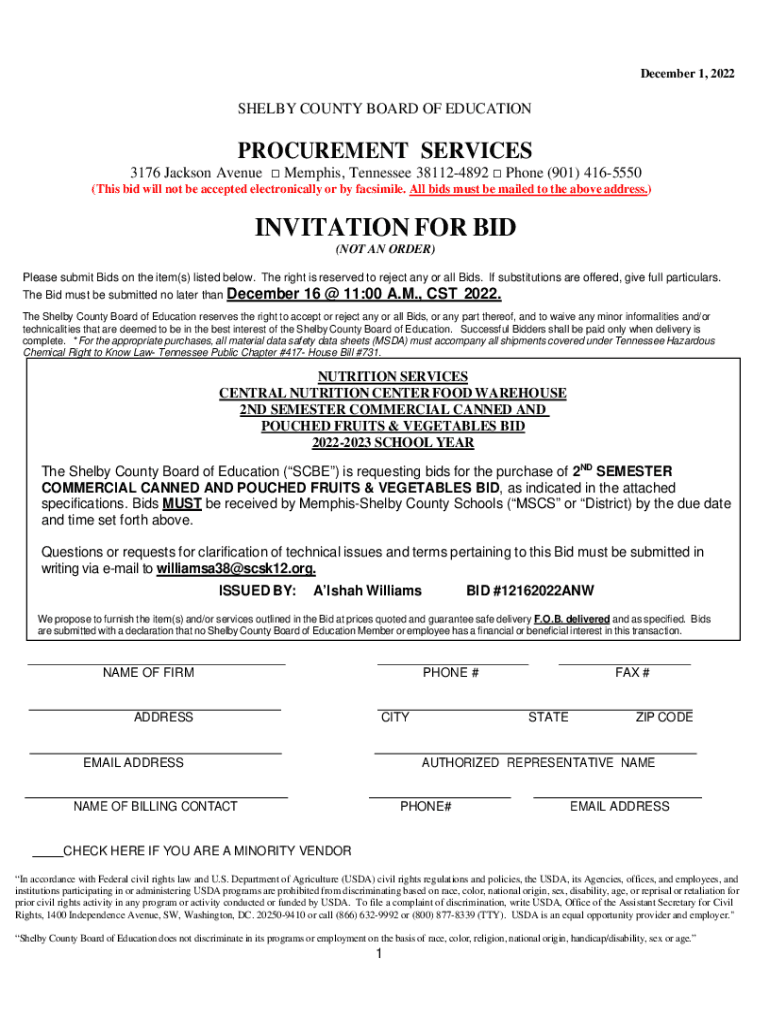 December 1, 2022SHELBY COUNTY BOARD OF EDUCATIONPROCUREMENT SERVICES3176 Jackson Avenue Memphis, Tennessee 381124892 Phone (901) 4165550 (This bid will not be accepted electronically or by facsimile.