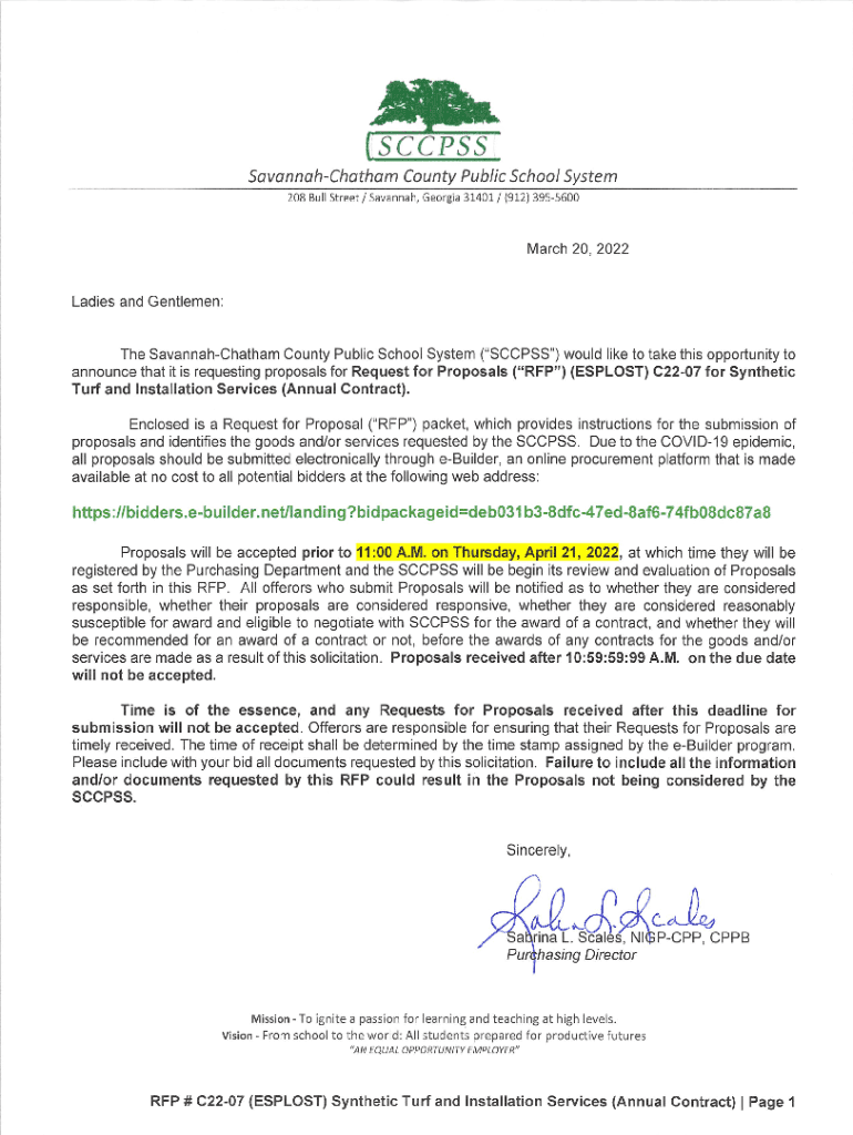 REQUEST FOR PROPOSALS RFP C2207 (EXPLOIT) Synthetic Turf and Installation Services (Annual Contract) I. INTRODUCTION The Board of Public Education for the City of Savannah and the County of Chatham