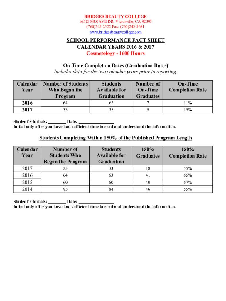 BRIDGES BEAUTY COLLEGE16515 MOJAVE DR, Victorville, CA 92395 (760)2452522 Fax: (760)2455681 www.bridgesbeautycollege.comSCHOOL PERFORMANCE FACT SHEET CALENDAR YEARS 2016 & 2017 Cosmetology 1600 Hours